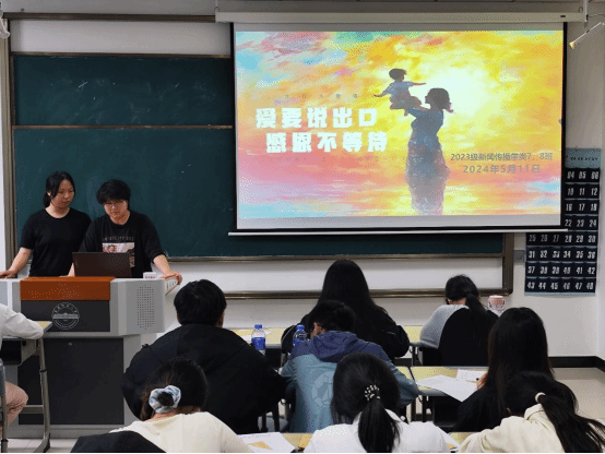 “同學(xué)們,猜一猜明天是什么節(jié)日啊?”“母親節(jié)!”5月11日,新聞傳播學(xué)類專業(yè)2023(7)、(8)班在K202教室開展以“愛要說出口,感恩不等待”為主題的團(tuán)建活動。活動開始前,活動負(fù)責(zé)人、新聞傳播學(xué)類專業(yè)2023(7)、(8)班的班長楊雨霏、朱研溪提前為每位同學(xué)準(zhǔn)備好信紙和信封。朱研溪說:“我們希望通過寫信這種傳統(tǒng)而深情的溝通方式,讓同學(xué)們勇敢表達(dá)自己的心聲,將對母親的愛訴說于筆尖。”學(xué)生們觀看一段關(guān)于母愛的感人短片后,...